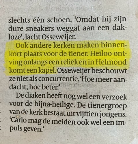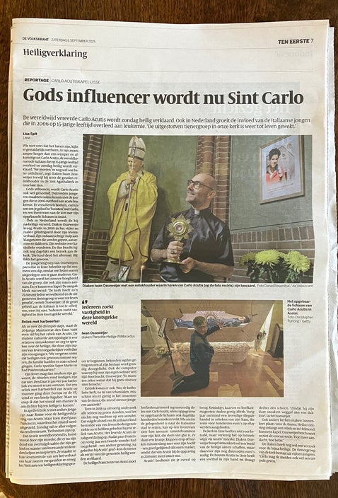 De Volkskrant plaatste op zaterdag 6 september 2025 een paginagroot artikel over de naderende heiligverklaring van Carlo Acutis. Het artikel gaat in op het leven van Carlo, een reliek van de bijna-heilige en de positieve invloed die de millennial heeft op een jongerengroep uit een parochie in Lisse. Carlo's groeiende bekendheid is landelijk merkbaar; in de voorlaatste alinea van het artikel maakt de Volkskrant melding van het kapelproject in Helmond.